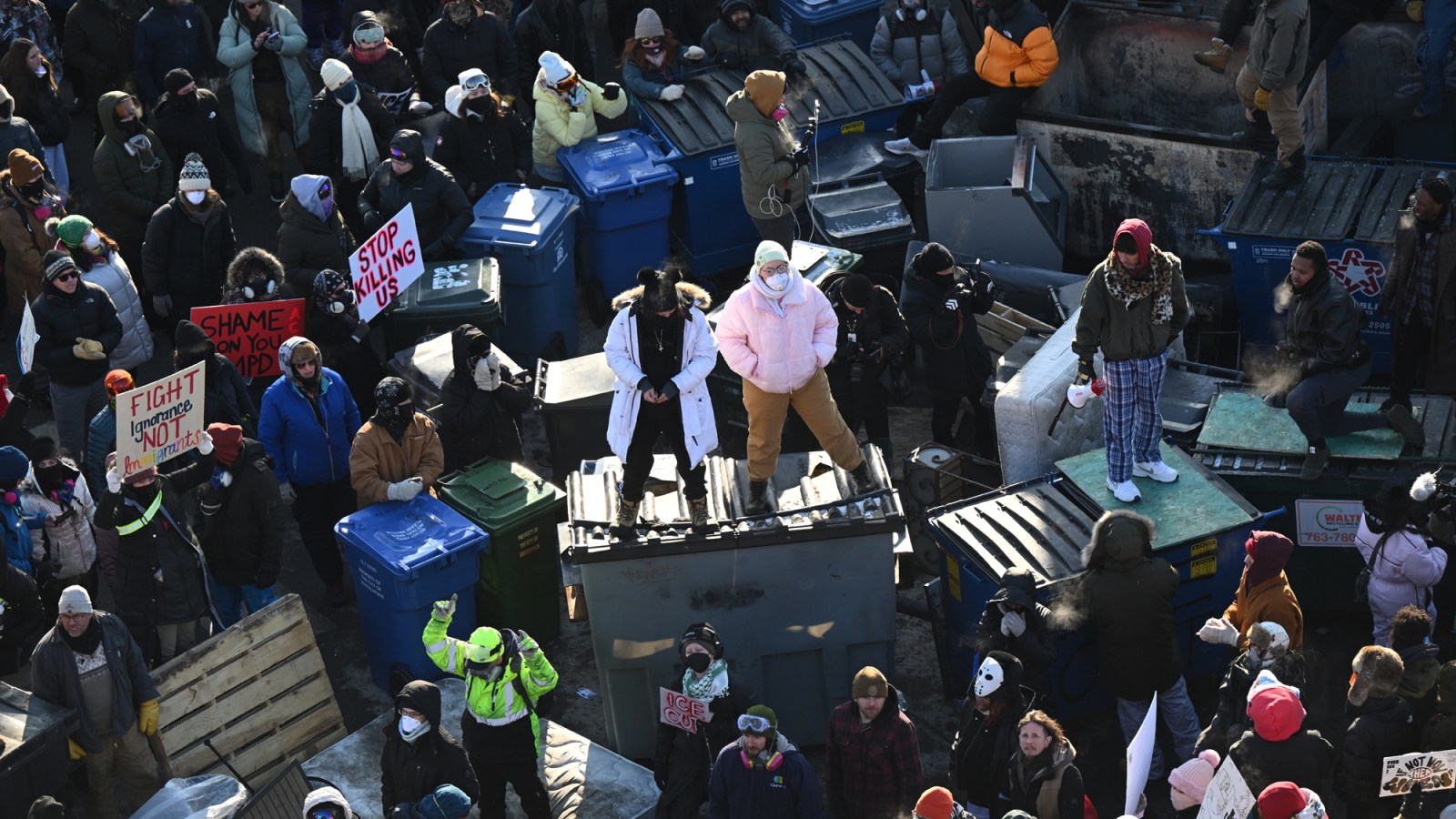 For Jones, doing his part meant observing, which led to at least four officers jumping on his back, handcuffing him, crushing his legs, and grinding his forehead into the frozen concrete. “It felt like I had a guy on each limb of my body,” he says. His gloves got knocked off his hands, and for over 15 minutes in the dangerous cold, he yelled for someone to put them back on. “Nobody was listening.” He was then stuffed into a Chevy Suburban with four agents desperate to get warm. When the car finally got moving, protesters began throwing obstacles in its path — Lime scooters, bicycles, seemingly anything that might trigger the car's automatic anti-collision braking system. ICE describes actions like this as “efforts to vandalize and destroy government vehicles.” Jones thinks it's the work of “beautiful American heroes.” They're his neighbors, and they're organized.